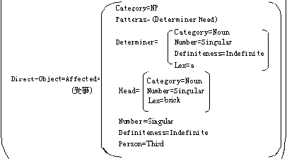 从以上定义的2(3)来看,这是一个递归定义。由于f的值v和v'本身又可以是复杂特征集,因此仅当v和v'可以合一时α和β才能合一。 如果把自然语言看作是-个信息传递系统,并且承认自然语言的合成性(compositionality)假设,即无论是句法成分还是语义成分都是按由小到大的方式逐步组合出来的,那么采用合一作为句法和语义分析的基本运算是非常理想的。因为: (1)一个句子或其他语法单位所承载的信息总是分布在它的各个成分中。所以每个成分承载的是局部信息。 (2)通过合-运算把小成分组合成更大成分的过程中,每个小成分所承载的信息也同时被传递和累加成为更大成分所承载的信息。在这个过程中信息只增不减。 (3)由于句法和语义都以合一为基本运算,不仅某些句法结构的歧义可以通过语义手段来排除,而且在句子的句法结构和语义表示之间找到了-种更自然的衔接方式。 (4)由定义可知,合一运算是无序的,即不论合-从哪个方向开始,也不管其运算的先后次序如何,合一结果都相同。合-的无序性不仅适宜于并行处理,而且使我们有可能自由地选择分析算法和语法理论。 FD1: ![]() ![]() |