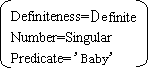 然后通过图中句法树上的标号,用具体变量Xi去置换各功能方程式中的元变量,如: (x1Subject):=x2 (1a) x1=x3 (1b) (x3Object)=x4 (3a) (x3Object2)=x5 (3b) (x3Tense)=Past (4a) (x3Predicate)=Hand<(x3Subject),(x3Object), (x3Object2)>' (4b) (x3Definiteness)=Indefinite (9a) (x2Number)=Singular (9b) (x3Number)=Singular (5a) (x2Predicate)='Girl' (5b) … … … 最后通过合一求得这个方程组的解。后者就是例句(10)的f-structure: ![]() ![]() x4= ![]() x5= ![]() 综上所述LFG具有如下几个待点: (1)采用复杂特征集,即属性值矩阵,作为表达语法信息的基本手段。 (2)以合一运算作为句法-语义分析的基本算法,合一运算的对象是表达语法信息的复杂特征集。 (3)句法-语义分析过程所依据的语言知识主要存储在机器词典的词条栏目中,整个分析过程是词汇驱动的。 (4)以无序的语法功能作为语法理论的基本观念。 由于具备这些重要特点,词汇功能语法克服了短语结构语法的许多缺陷,成为计算语言学的重要成果之-。据文献报导,LFG已被美国卡内基-梅隆大学的基于知识的机器翻译系统KBMT、美国曼彻斯待理工大学的英日机器翻译系统NTRAN和日本财团bravis开发的机器翻译系统采用。 |