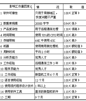 10、从供选择的答案中选出与下列有关软件成本估算叙述相对应的正确答案,将其编号填入到相应的括弧( )内。 一个规模为10KDSI的商用微机远程通信的嵌入型软件,使用中间COCOMO模型进行软件成本估算。程序的名义工作量MM = ( A );程序实际工作量MM = ( B );开发所用的时间TDEV = ( C );如果软件开发人员的工资都按每月6000美元计算,则该软件项目的开发人员的工资总额 = ( D )。 ��表1 中间COCOMO模型的名义工作量与进度公式 ��表2 影响工作量的因素fi 的取值